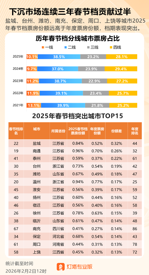 从地域分布角度来看,下沉市场仍是影响春节档格局的重要因素。灯塔专业版数据显示,三四线城市已连续三年在春节档贡献出过半票房。“山河四省”(山西、河南、山东、河北)及苏皖赣地区依旧是春节档兵家必争之地。数据显示,江苏省因盐城、南通、泰州等多个地级市的强劲表现,已连续五年蝉联春节档省份票房冠军。